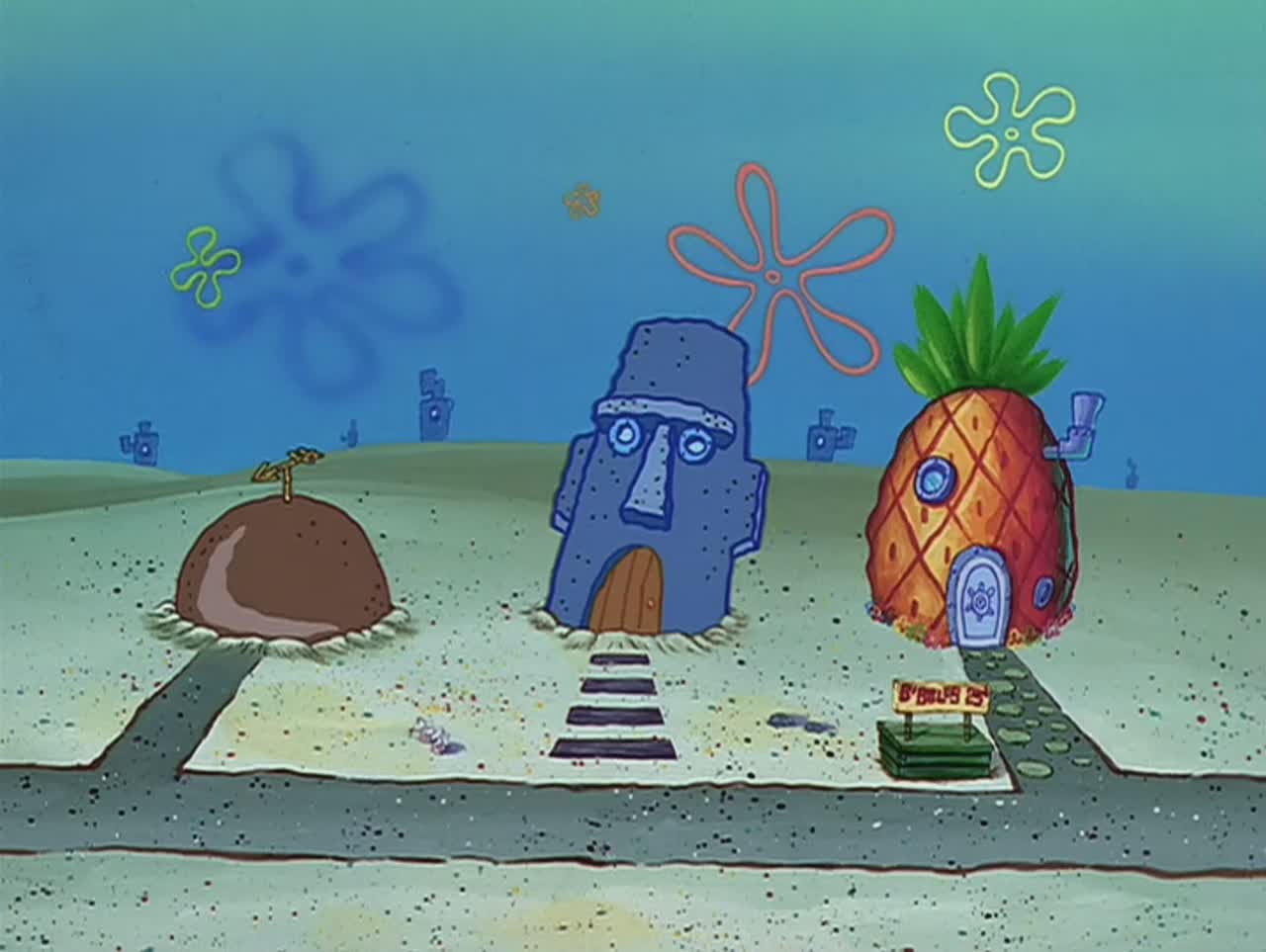Население подводного городка Бикини Боттом составляют разные морские обитатели. Среди них - лучший друг Спанч Боба, морская звезда по имени Патрик, раздражительный надменный кальмар Сквидвард и белка по имени Сэнди, которая тоже живёт под водой, используя гидрокостюм. Спанч Боб работает поваром в закусочной «Красти Краб», которая управляется старым скрягой мистером Крабсом