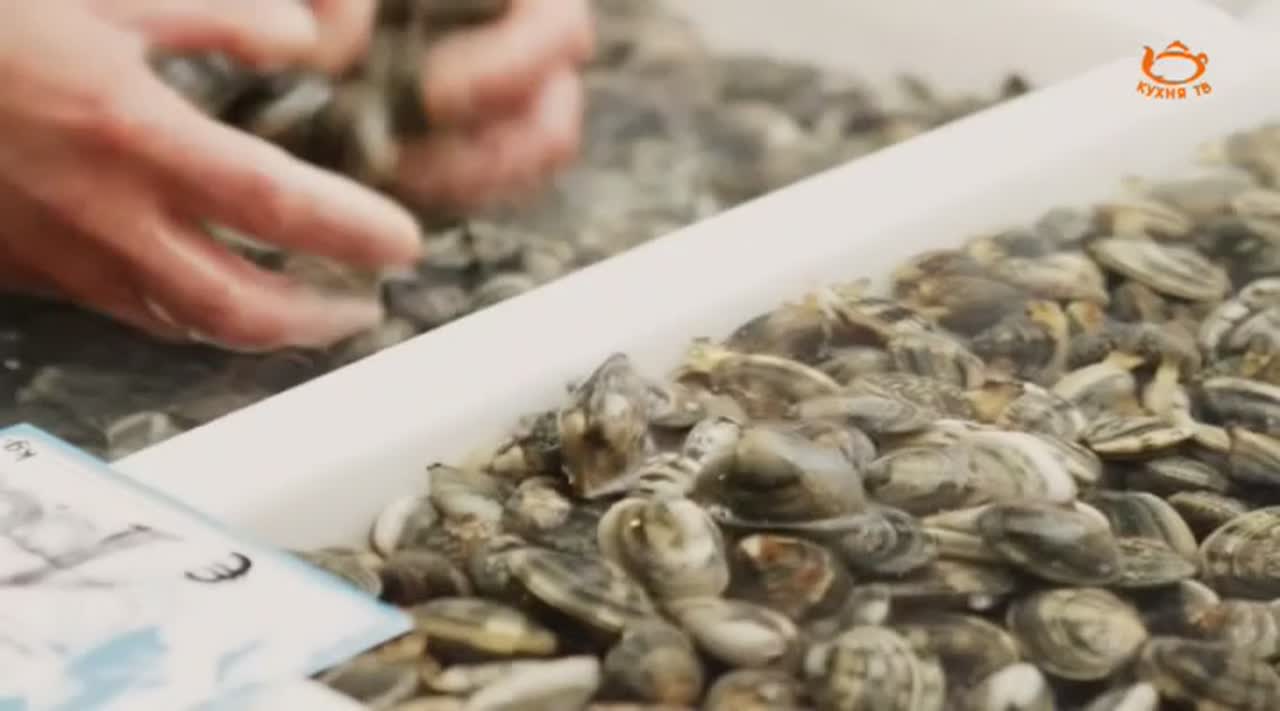 Фаршированные мидии; Пюре из бобов, цикория и анчоусов; Ризотто с чернилами каракатицы