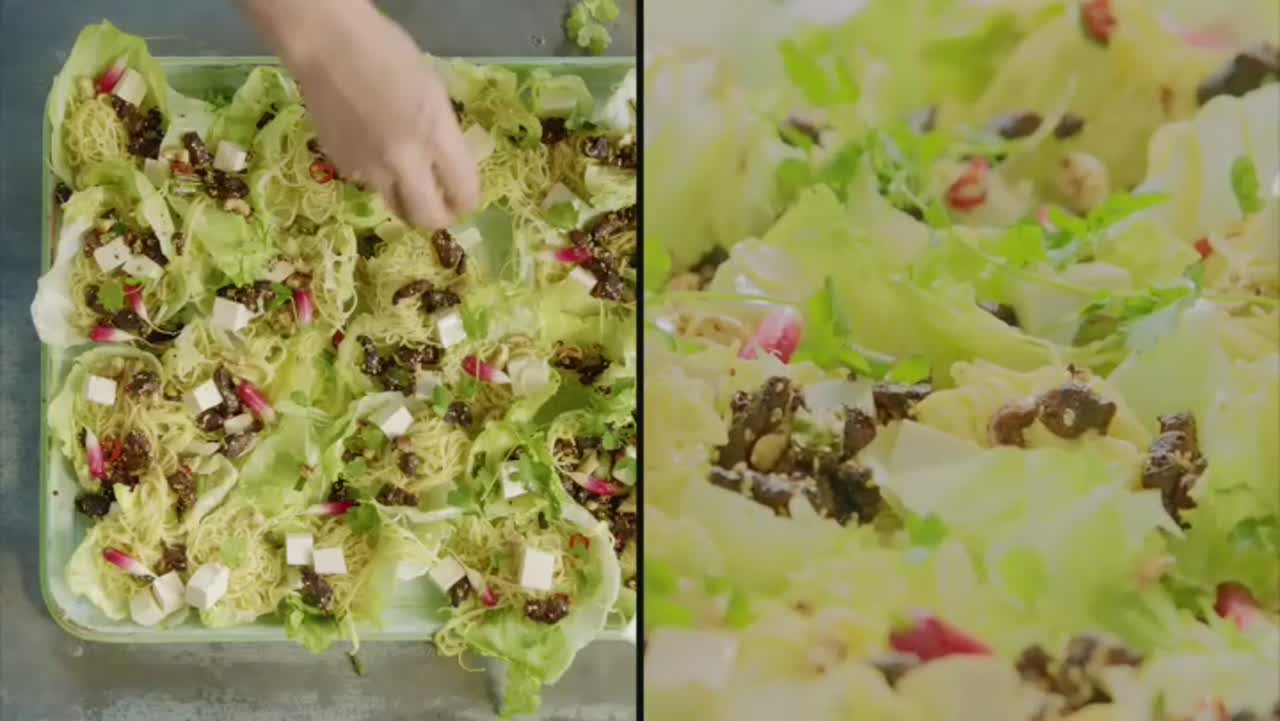 Китайская курочка с соусом хоисин с воздушными кокосовыми булочками и золотистые крабовые брики из Туниса